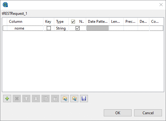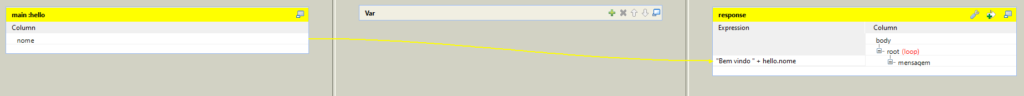 Por fim, adicionamos um componente intermediário chamado tXMLMap, que irá mapear os argumentos recebidos pelo componente tRESTRequest (neste caso a coluna “nome”) para o retorno produzido pela API. Em seguida conectamos estes três componentes: