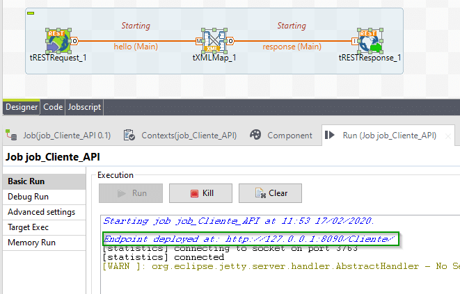 Isso é basicamente tudo o que você precisa fazer para desenvolver uma API REST com o Talend ESB. Agora podemos executar o job pressionando F6 e ao fazer isso você irá notar que o Talend Studio irá lhe informar qual é o Endpoint do serviço: