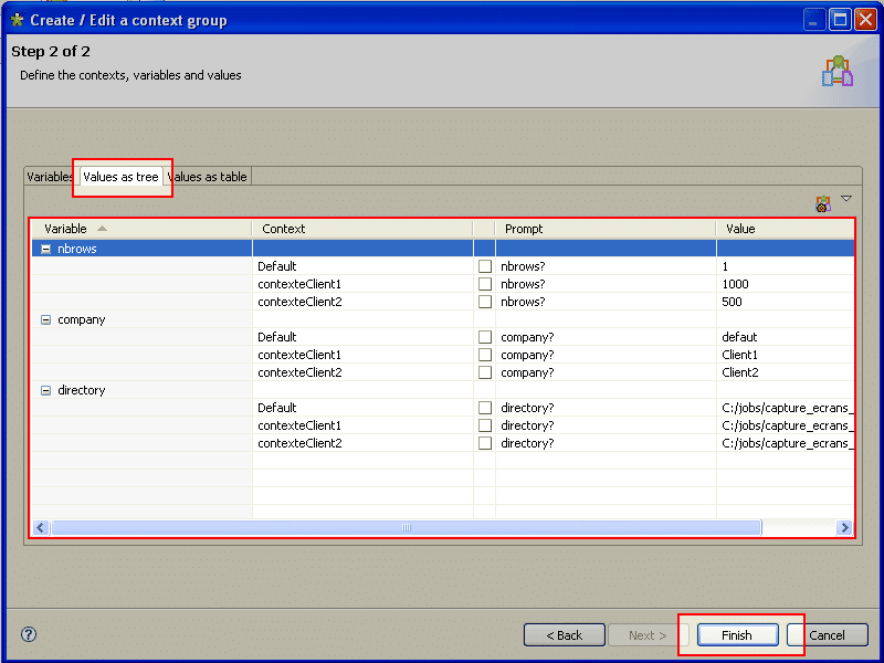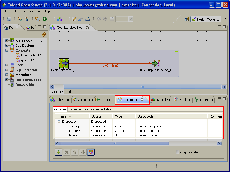 Até aqui, temos nosso job desenvolvido em seu componentes e links. No componente de entrada, irá gerar registros da maneira como acabamos de configurar. Assim como o de saída, que já tem seu caminho configurado. Então vamos partir para o que interessa, as variáveis de contexto. Execute e job e verifique o arquivo criado, bem como seus dados, diretório, e nome, assim como foram setados. Crie as variáveis de contexto no repositório. Para isso, clique com o botão direito em Contexts na aba lateral de repositório de trabalho. Selecione Create context group, dê um nome ao seu grupo de contexto. Sugiro sempre usar um nome parecido ao do projeto. Clique em next. Estamos agora no campo onde poderemos criar e setar nossas variáveis. Para criar, clique em [+], três vezes,dê nomes as variáveis e indique seus tipos, company(String), diretory(Directory) e nbrows(int). Clique na aba Values as tree e em Configure Contexts. Então, clique em New para adicionar novos contextos, sendo eles: contextClient1 e contextClient2. Dê OK. Ainda na aba Values as tree, defina vlaores para as variáveis de cada contexto.